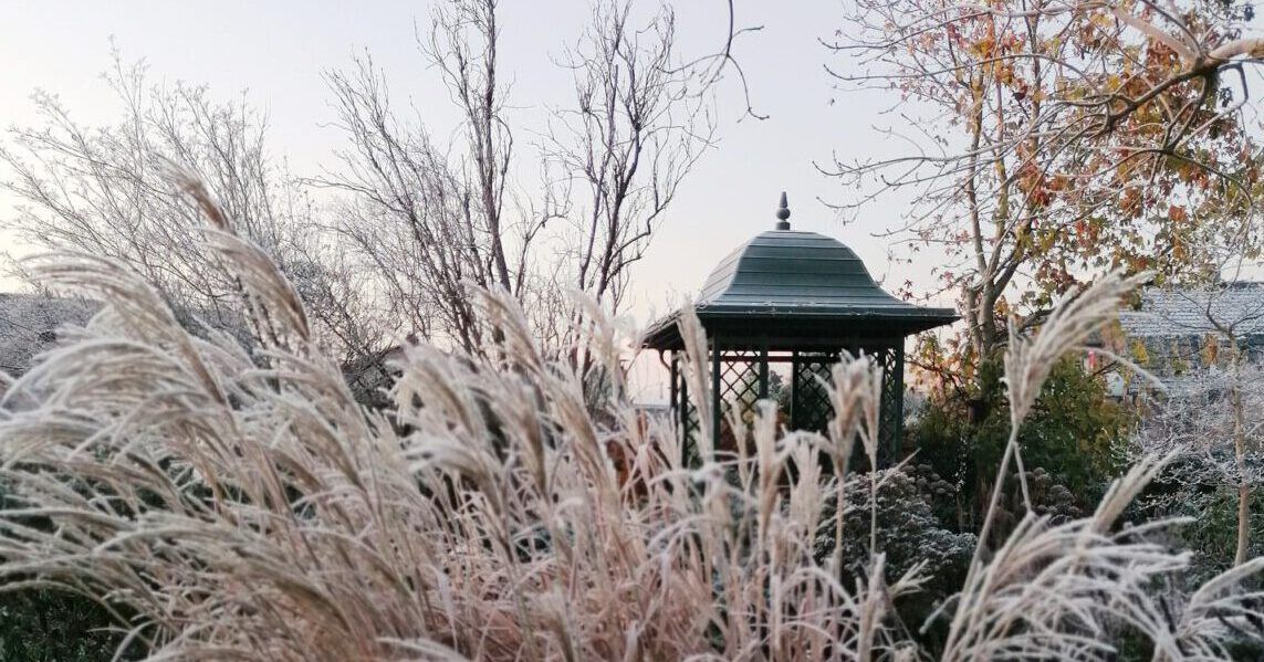 Die Blütenstände der Stauden, die Gräser, der Bambus, Pavillon und Rosenranken. Ein kurzer Augenblick nur, bis die Sonne durchbricht.