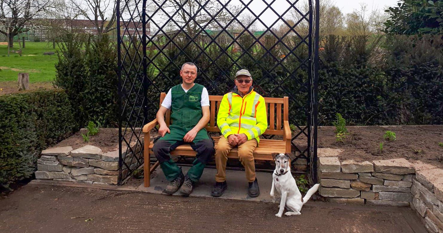 So planten Frank Ulbrich und Michael Wesser verschiedene Varianten (eckig / rund) und Einfassungen, bis die finale Form gefunden war. Die Bepflanzung wurde blau-weiß konzipiert und wir lassen uns überraschen, wie es aussieht, wenn sie blüht.